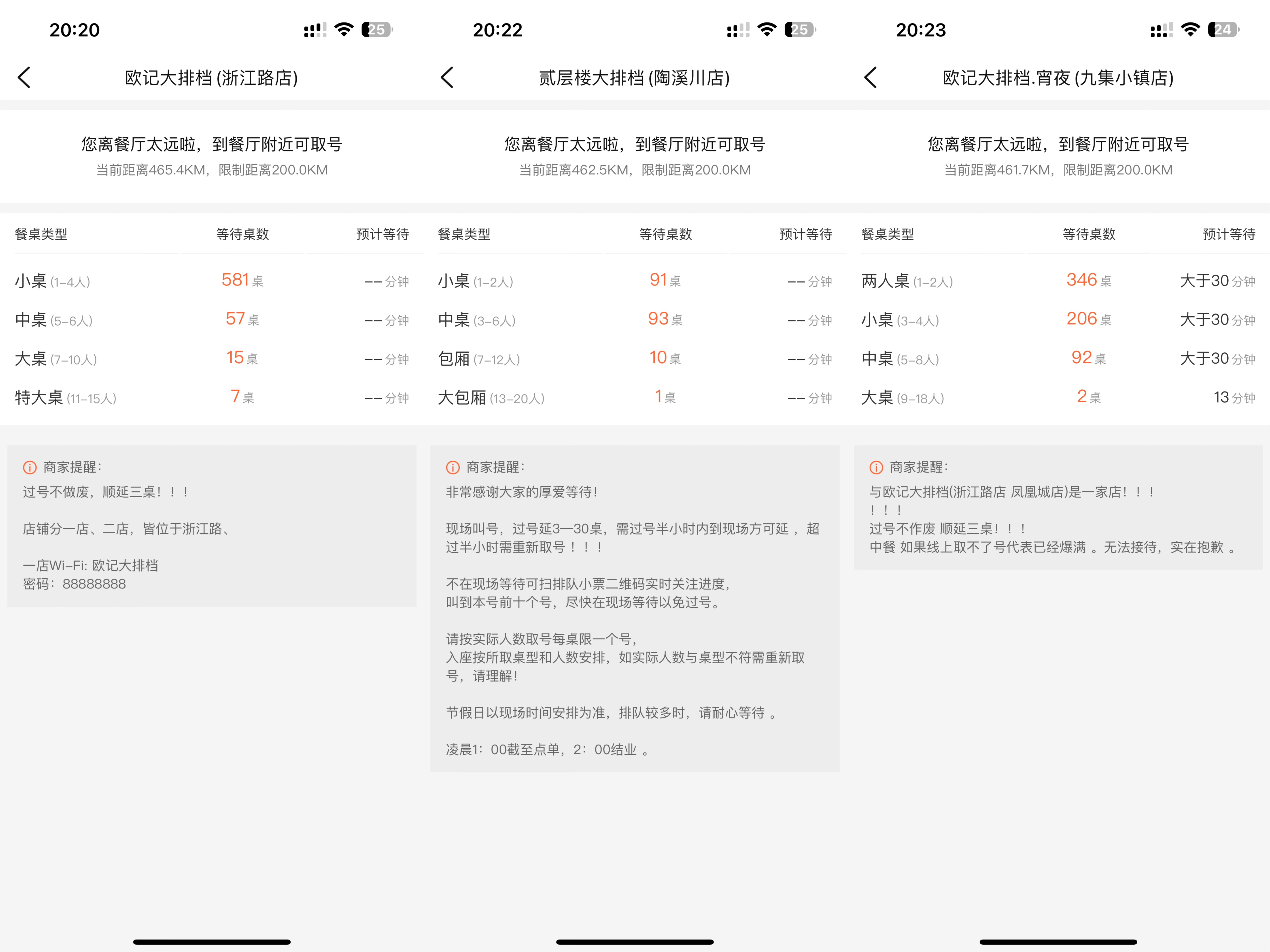 4月4日晚,澎湃新聞在大眾點(diǎn)評上搜索發(fā)現(xiàn),景德鎮(zhèn)多家餐廳爆滿。如截至當(dāng)日20:20,歐記大排檔浙江路店的小桌需等待581桌,中桌需等待57桌。截至當(dāng)日20:22,貳層樓大排檔陶溪川店的小桌需等待91桌,中桌需等待93桌。截至當(dāng)日20:23,歐記大排檔九集小鎮(zhèn)店的兩人桌需等待346桌,小桌需等待206桌,中桌需等待92桌。