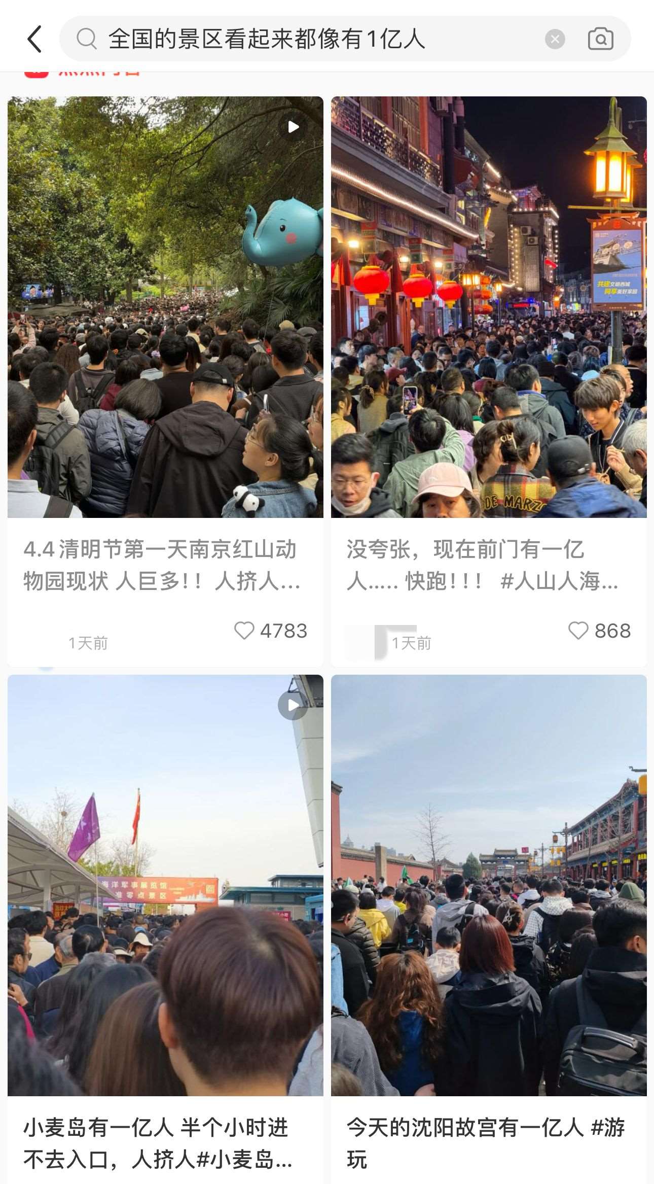 社交平臺上,在一個“全國的景區(qū)看起來都像有1億人”的話題下面,在各地旅游的網(wǎng)友們紛紛上傳在當(dāng)?shù)氐穆糜握掌?,無一不是“人山人海”。