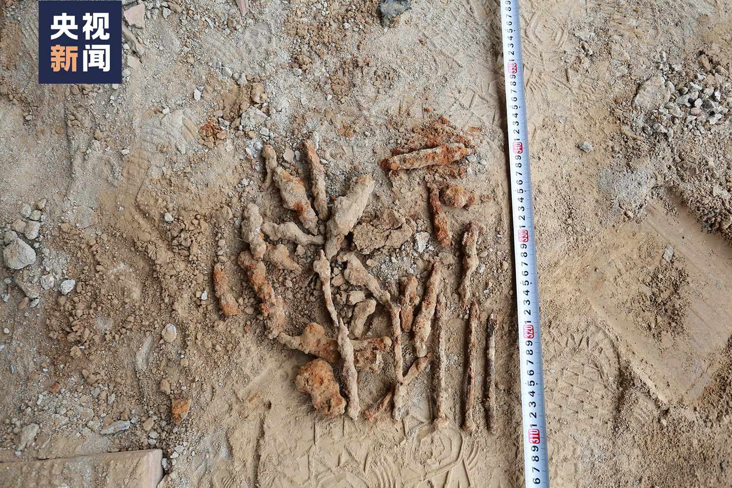 △雪村戰(zhàn)斗烈士墓出土的鐵釘,猜測是當?shù)厝罕娪脕硌诼窳沂康拈T板腐蝕后留下的。