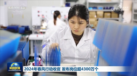 央視網(wǎng)消息(新聞聯(lián)播):記者從人力資源社會(huì)保障部了解到,為勞動(dòng)者和用人單位提供就業(yè)服務(wù)的2024年春風(fēng)行動(dòng)剛剛結(jié)束,其間,累計(jì)舉辦各類招聘活動(dòng)6.4萬場(chǎng),發(fā)布崗位4300多萬個(gè)。