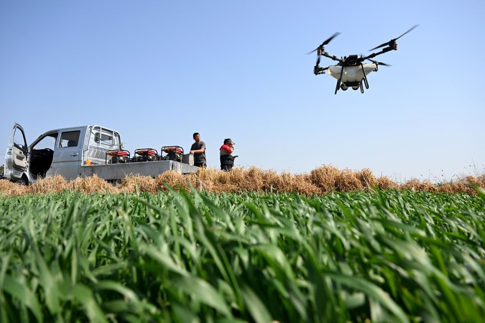 2024年3月22日,在安徽省合肥市廬江縣同大鎮(zhèn),工作人員操作植保無人機(jī)為小麥?zhǔn)┓省P氯A社記者 黃博涵 攝