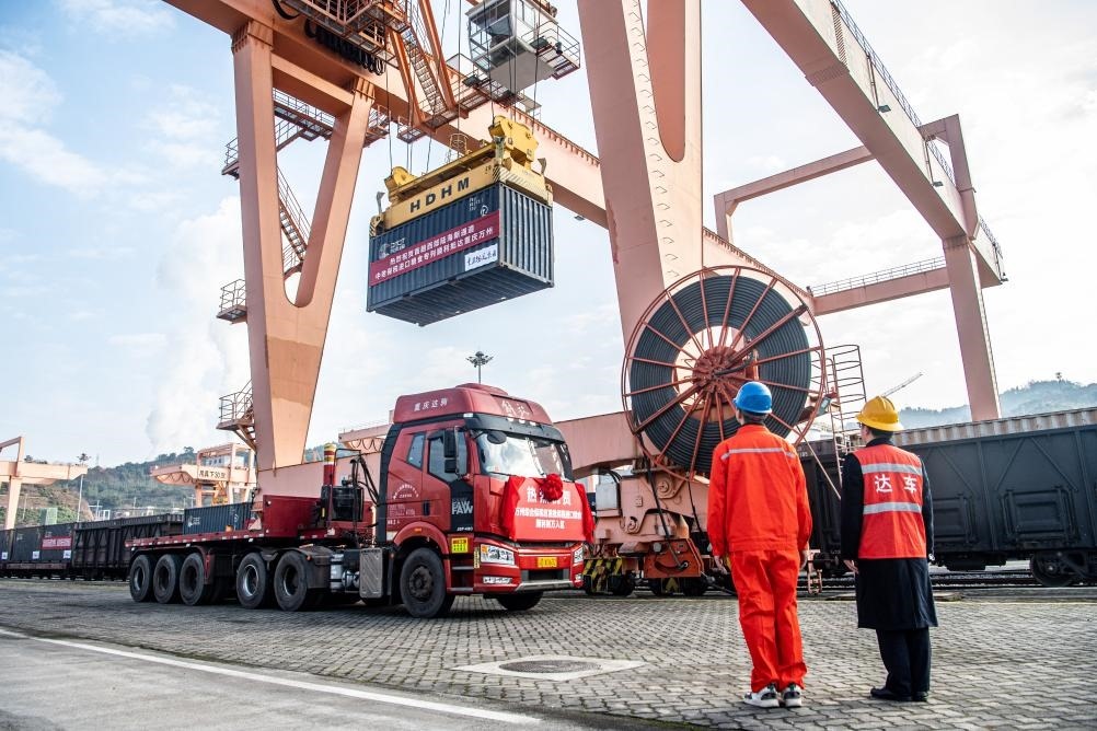 1月4日,在重慶萬州新田港站,工作人員進(jìn)行集裝箱吊裝作業(yè),將專列貨物轉(zhuǎn)運(yùn)至公路物流環(huán)節(jié)。新華社記者 唐奕 攝