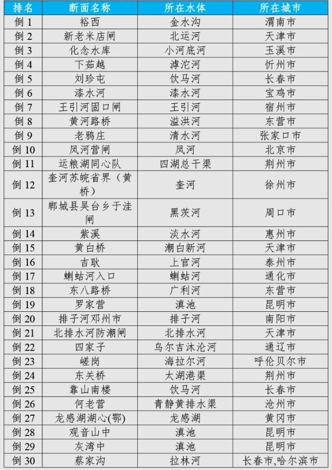 咸陽(yáng)市泔河入涇河、朝陽(yáng)市大凌河西支入河口和綏化市/黑河市通肯河大橋等30個(gè)國(guó)家地表水考核斷面水環(huán)境質(zhì)量變化情況相對(duì)較好(從第1名至第30名),渭南市裕西、天津市新老米店閘和玉溪市化念水庫(kù)等30個(gè)國(guó)家地表水考核斷面水環(huán)境質(zhì)量變化情況相對(duì)較差(從倒數(shù)第1名至倒數(shù)第30名)。