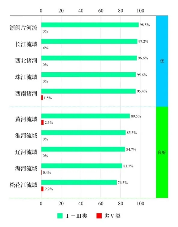 1—3月,長(zhǎng)江、黃河、珠江、松花江、淮河、海河、遼河等七大流域及西北諸河、西南諸河和浙閩片河流水質(zhì)優(yōu)良(Ⅰ—Ⅲ類)斷面比例為91.5%,同比上升1.2個(gè)百分點(diǎn);劣Ⅴ類斷面比例為0.5%,同比上升0.1個(gè)百分點(diǎn)。主要污染指標(biāo)為化學(xué)需氧量、高錳酸鹽指數(shù)和氨氮。其中,長(zhǎng)江流域、珠江流域、浙閩片河流、西北諸河和西南諸河水質(zhì)為優(yōu);黃河流域、松花江流域、淮河流域、海河流域和遼河流域水質(zhì)良好。