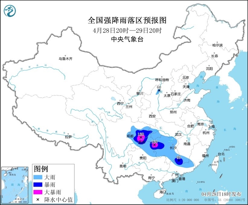 預(yù)計,4月28日20時至29日20時,湖北西南部、湖南大部、江西南部、四川盆地中東部、重慶大部、貴州東部、廣東北部等地部分地區(qū)有大到暴雨,其中,湖南西部、四川盆地東部、重慶東南部和西南部、貴州東北部等地部分地區(qū)有大暴雨(100~160毫米)。上述部分地區(qū)伴有短時強降水(最大小時降雨量30~60毫米,局地可超過80毫米),局地有雷暴大風(fēng)或冰雹等強對流天氣。
