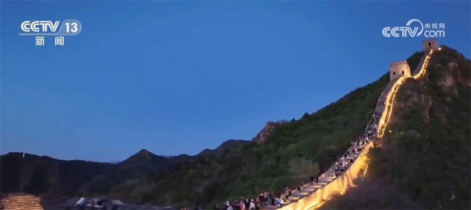 在密云,司馬臺(tái)長城也在夜間被“點(diǎn)亮”,如火龍般在山間蜿蜒。游客可以提燈夜游,感受古長城的磅礴氣勢,也能泛舟河面,遠(yuǎn)望山巒朦朧,近觀燈火輝煌。景區(qū)還推出音樂、舞蹈、詩歌和繪畫相結(jié)合的演出活動(dòng),無人機(jī)在夜空中的飛行表演也給市民游客帶來了震撼的視聽享受。