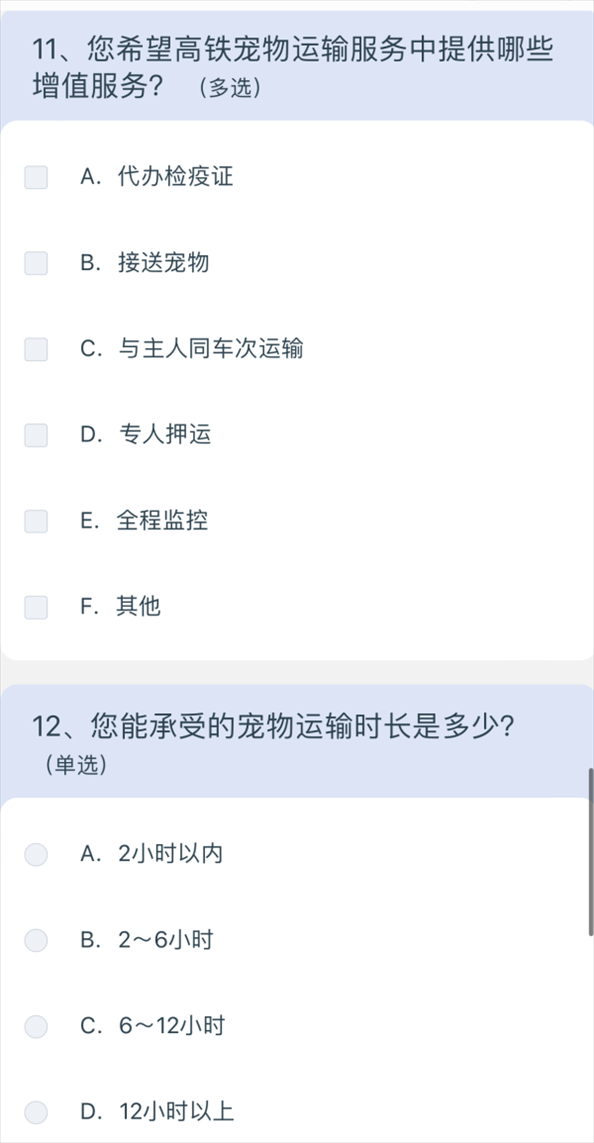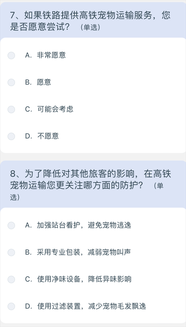 問(wèn)卷涉及寵物運(yùn)輸服務(wù)定價(jià)、非養(yǎng)寵人士建議等