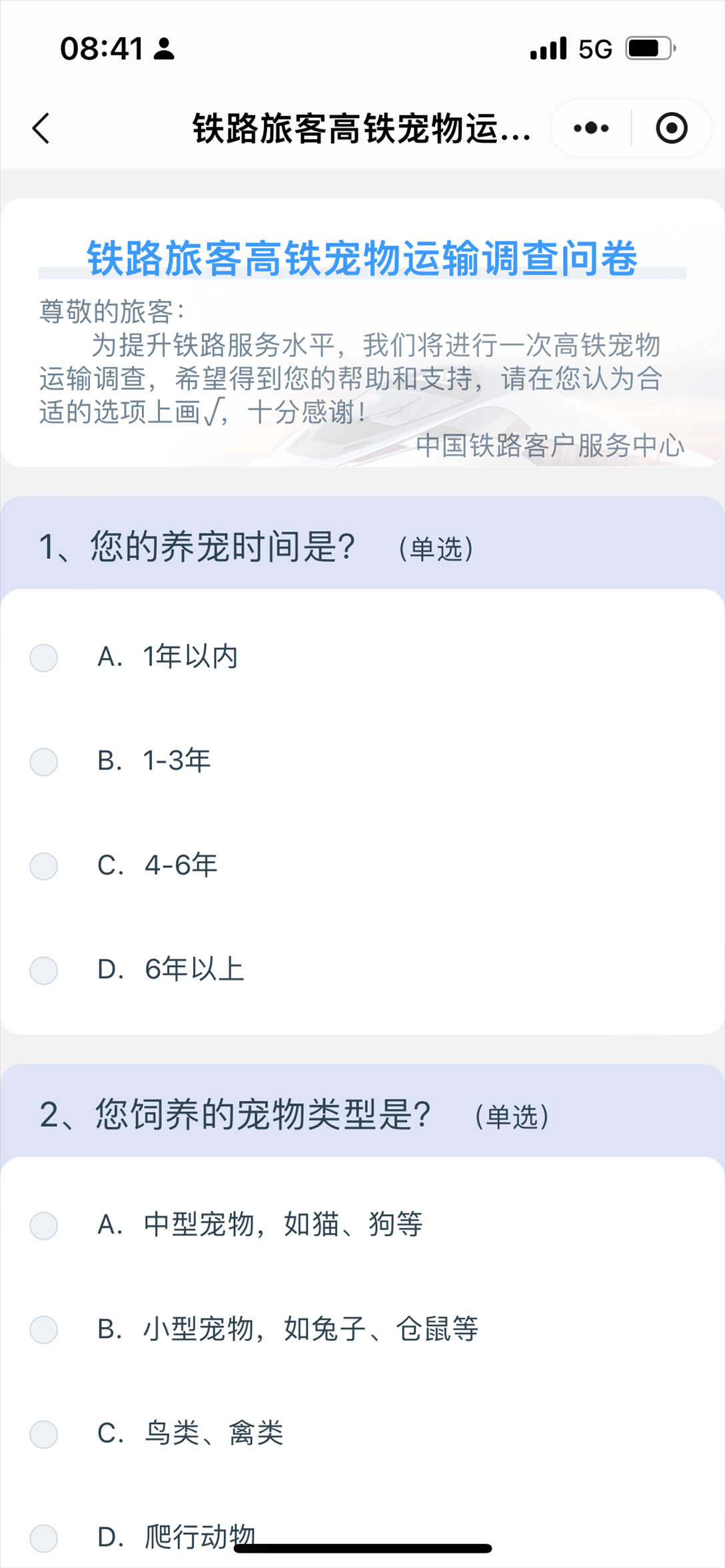 中國(guó)鐵路客戶服務(wù)中心推出高鐵寵物運(yùn)輸調(diào)查問(wèn)卷。 截屏圖