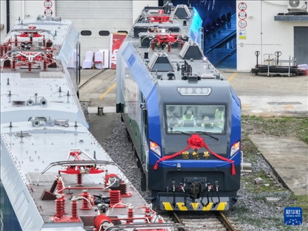 國內(nèi)首臺新型智能重載電力機(jī)車在湖南株洲下線。