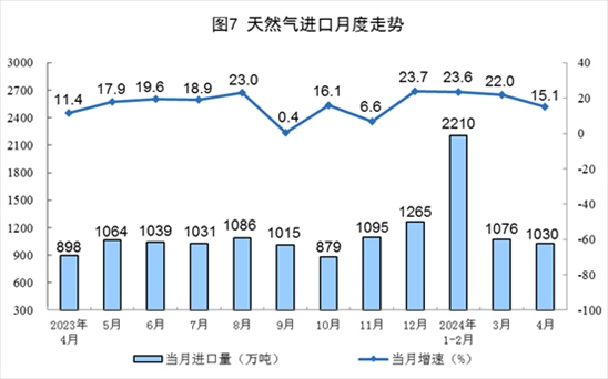1—4月份,規(guī)上工業(yè)天然氣產(chǎn)量830億立方米,同比增長5.0%。進口天然氣4300萬噸,同比增長20.7%。