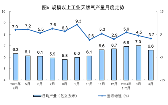 天然氣生產(chǎn)穩(wěn)定增長,進口保持較快增長。4月份,規(guī)上工業(yè)天然氣產(chǎn)量198億立方米,同比增長3.2%,增速比3月份放緩1.3個百分點;日均產(chǎn)量6.6億立方米。進口天然氣1030萬噸,同比增長15.1%。