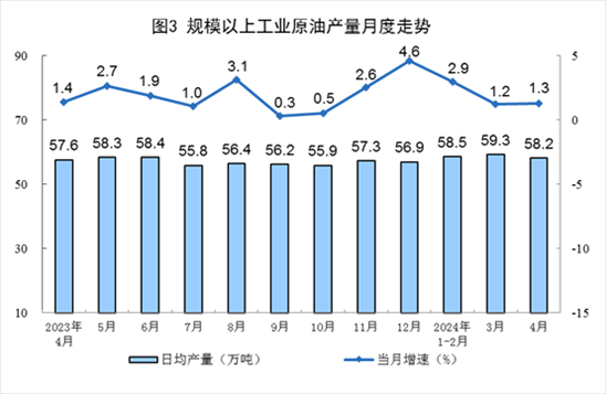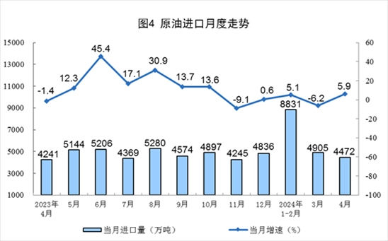 原油生產(chǎn)平穩(wěn)增長,進口由降轉增。4月份,規(guī)上工業(yè)原油產(chǎn)量1747萬噸,同比增長1.3%,增速比3月份加快0.1個百分點;日均產(chǎn)量58.2萬噸。進口原油4472萬噸,同比增長5.9%。