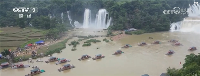 水量大增的瀑布奔騰而下沖擊著河面水聲轟鳴,慕名前來(lái)的游客們或乘坐竹筏感受瀑布的恢弘氣勢(shì),或?qū)ふ易罴褭C(jī)位與瀑布“打卡”合影。除了近距離觀(guān)賞德天跨國(guó)瀑布,也有不少游客選擇跨境游玩,站在越南境內(nèi)的板約瀑布看德天瀑布,以不同視角體驗(yàn)中越風(fēng)情。