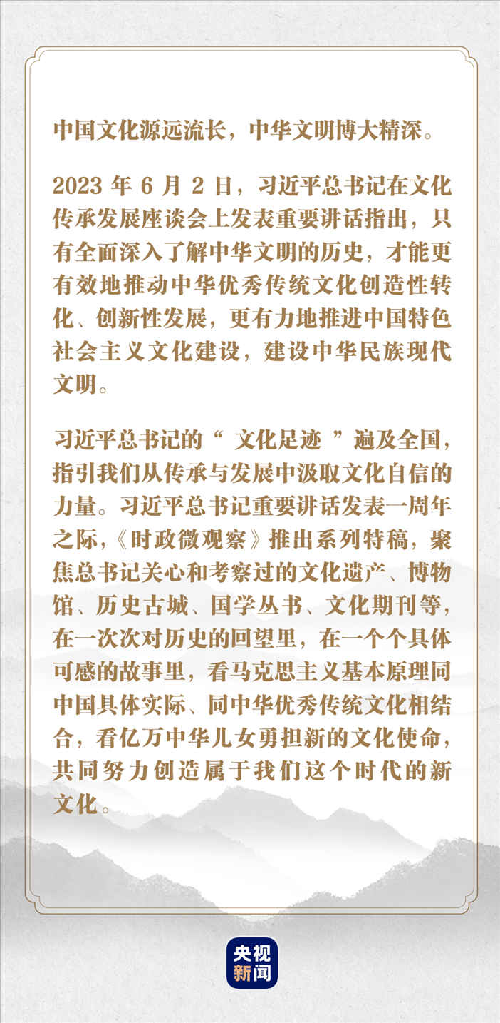 “這段時(shí)間,我一直在思考推進(jìn)中國特色社會(huì)主義文化建設(shè)、建設(shè)中華民族現(xiàn)代文明這個(gè)重大問題?!?023年6月2日,在文化傳承發(fā)展座談會(huì)上,習(xí)近平總書記指出,“只有全面深入了解中華文明的歷史,才能更有效地推動(dòng)中華優(yōu)秀傳統(tǒng)文化創(chuàng)造性轉(zhuǎn)化、創(chuàng)新性發(fā)展,更有力地推進(jìn)中國特色社會(huì)主義文化建設(shè),建設(shè)中華民族現(xiàn)代文明。”