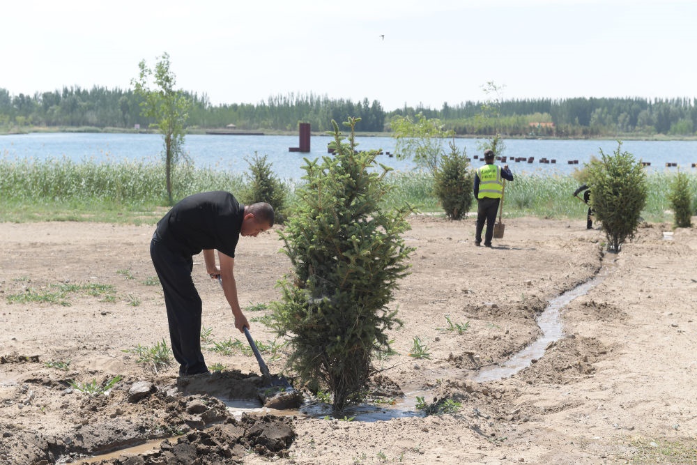?2024年4月23日,在地處黃河“幾字彎”的內(nèi)蒙古巴彥淖爾市臨河區(qū),新華林場(chǎng)職工給新栽種的樹(shù)木澆水。新華社記者 李云平 攝