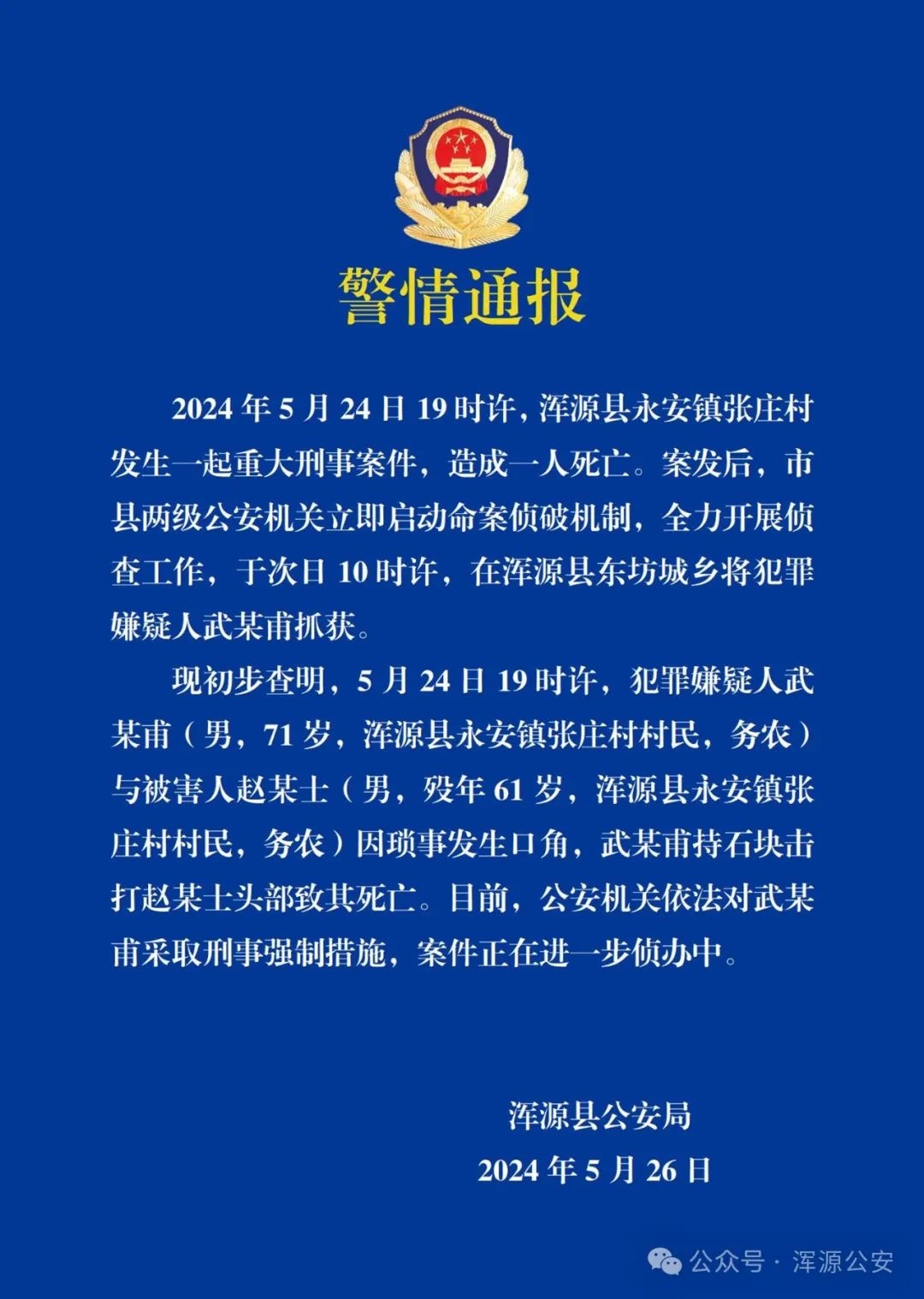 現(xiàn)初步查明,5月24日19時許,犯罪嫌疑人武某甫(男,71歲,渾源縣永安鎮(zhèn)張莊村村民,務(wù)農(nóng))與被害人趙某士(男,歿年61歲,渾源縣永安鎮(zhèn)張莊村村民,務(wù)農(nóng))因瑣事發(fā)生口角,武某甫持石塊擊打趙某士頭部致其死亡。目前,公安機(jī)關(guān)依法對武某甫采取刑事強(qiáng)制措施,案件正在進(jìn)一步偵辦中。