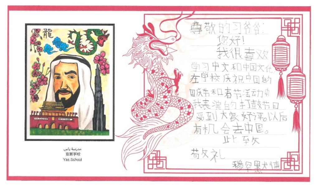 在5年級學(xué)生穆罕默德的畫筆下,北京天安門和迪拜哈利法塔并排而立,四周鮮花盛開。這個多才多藝的男孩在信中告訴習(xí)爺爺,自己很喜歡學(xué)中文和中國文化,學(xué)校組織了春節(jié)、中國國慶等活動,他表演的打鼓受到好評。他期待“以后有機(jī)會去中國”。