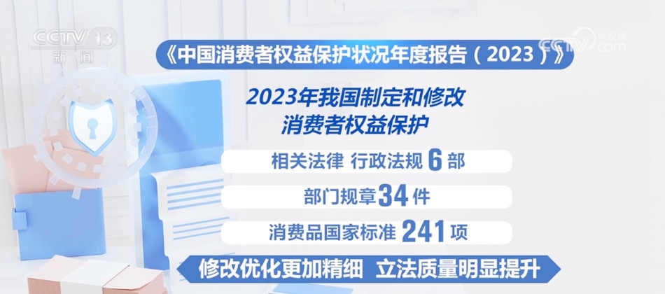 年度報告顯示,2023年我國制定和修改了消費者權(quán)益保護相關(guān)法律、行政法規(guī)6部、部門規(guī)章34件、消費品國家標(biāo)準(zhǔn)241項,修改優(yōu)化更加精細,立法質(zhì)量明顯提升。