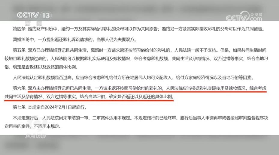 陜西省韓城市人民法院芝陽人民法庭庭長王春妮:“我們跟原告充分釋法明理,讓他知道咱們國家有新的規(guī)定,對他經(jīng)過反復做工作,他也降低了自己的心理預期。被告這邊認為我跟你在一起共同生活了,我也是實心想跟你過日子,但是因為沒有領(lǐng)證,而且我還跟你共同生育了一個孩子,你現(xiàn)在要求我給你返還彩禮,我就不愿意返還,心里有抵抗情緒?!?/p>