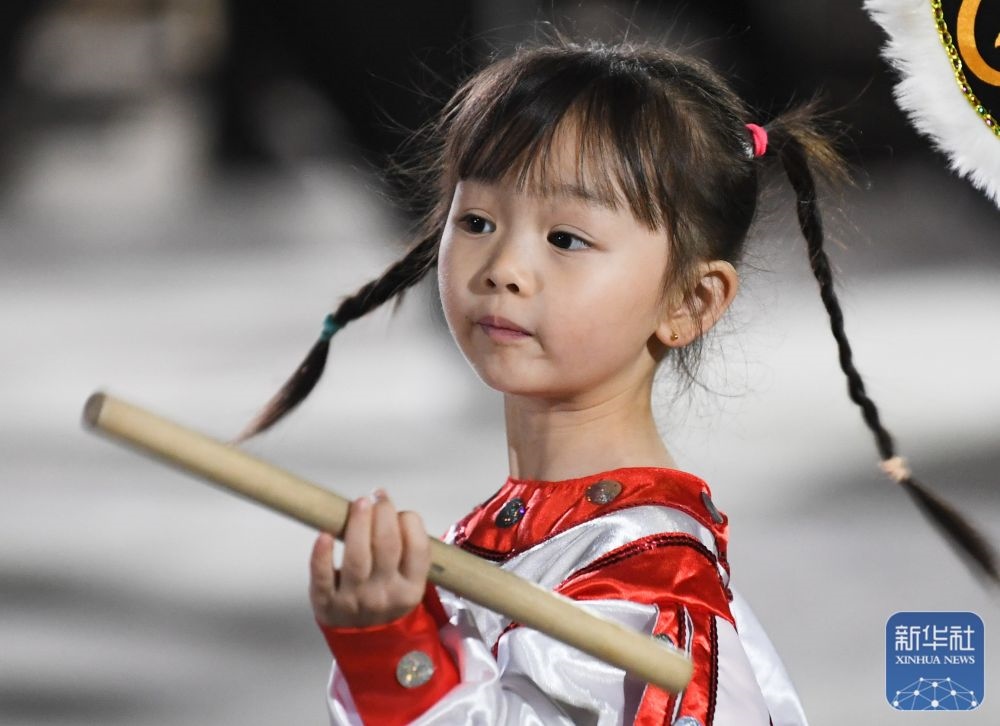 在貴嶼鎮(zhèn)玉窖村莊恩琪家的客廳里,擺著小鼓、小鈸、“小蛇”道具和“迷你版”英歌槌。莊恩琪的父親莊镕強(qiáng)是玉窖村玉和興英歌隊(duì)中的一名鑼鼓手。莊恩琪常跟著父親到英歌隊(duì)的排練場(chǎng),看著英歌隊(duì)“敲鑼打鼓跳英歌”,耳濡目染中對(duì)英歌舞產(chǎn)生了濃厚的興趣。 當(dāng)激昂的鼓點(diǎn)響起,莊恩琪變得專注,掄起小槌跟著隊(duì)員們舞動(dòng)起來,“又猛又萌”的動(dòng)作讓圍觀的村民不時(shí)報(bào)以笑聲和掌聲。?