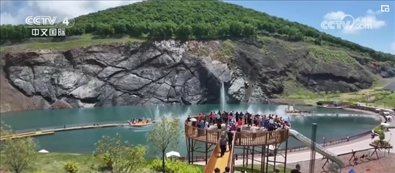 在黑龍江雙鴨山的翡翠湖礦坑公園,藍綠色湖水在陽光照耀下如詩如畫。游客們身處山野間,感受著自然之美和夏日清涼。