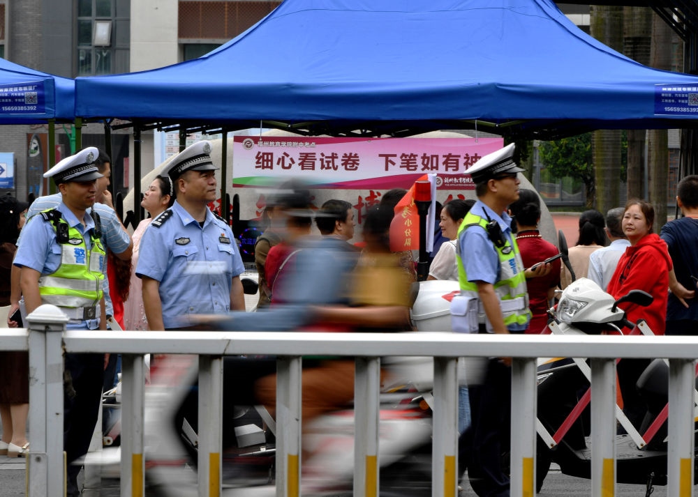 ↑6月7日,在福建福州鼓樓考區(qū)福州教育學(xué)院附屬中學(xué)考點,公安交警在維持考場周邊秩序。