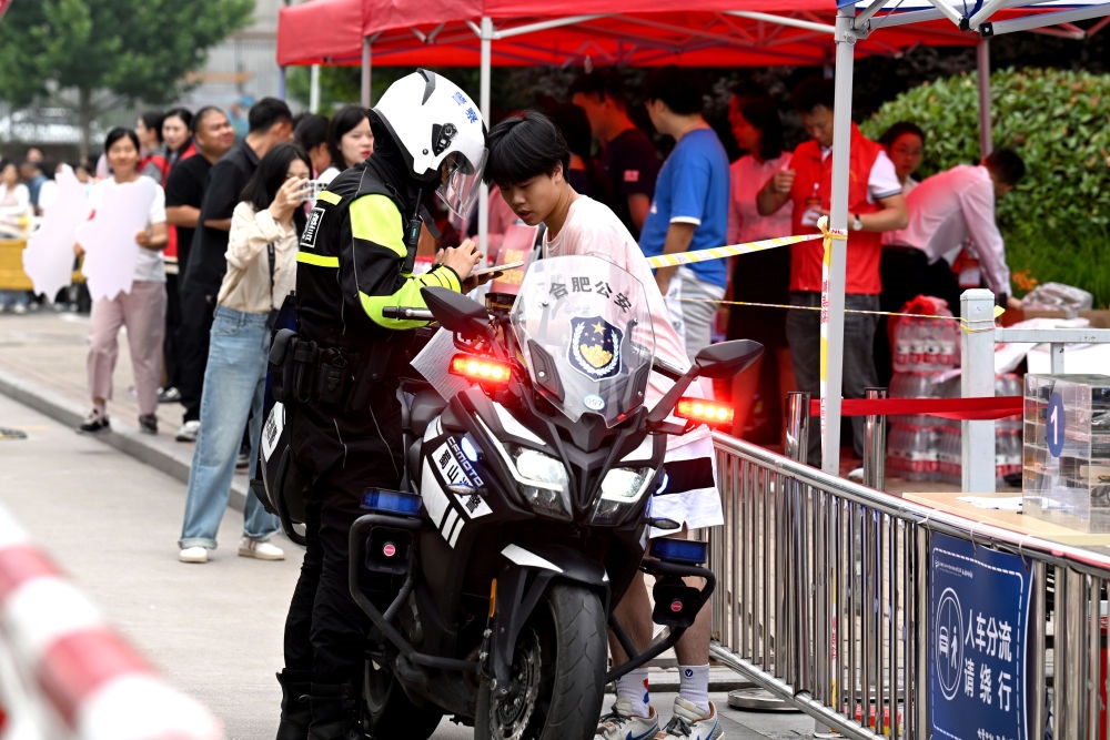 ↑6月7日,民警護(hù)送一名考生順利抵達(dá)安徽合肥市五十中學(xué)天鵝湖教育集團(tuán)天鵝湖校區(qū)考點。