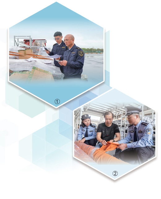 圖①:上海海關(guān)所屬松江海關(guān)工作人員檢查貨物。上海海關(guān)致力打造通關(guān)手續(xù)更簡(jiǎn)便、通關(guān)效率更快捷、監(jiān)管更嚴(yán)密有效的營(yíng)商環(huán)境。姜輝輝攝(人民視覺(jué)) 圖②:江蘇南通通州區(qū)公安局西亭派出所民警走進(jìn)生產(chǎn)車(chē)間,了解企業(yè)情況,護(hù)航企業(yè)經(jīng)營(yíng)發(fā)展。翟慧勇攝(人民視覺(jué))