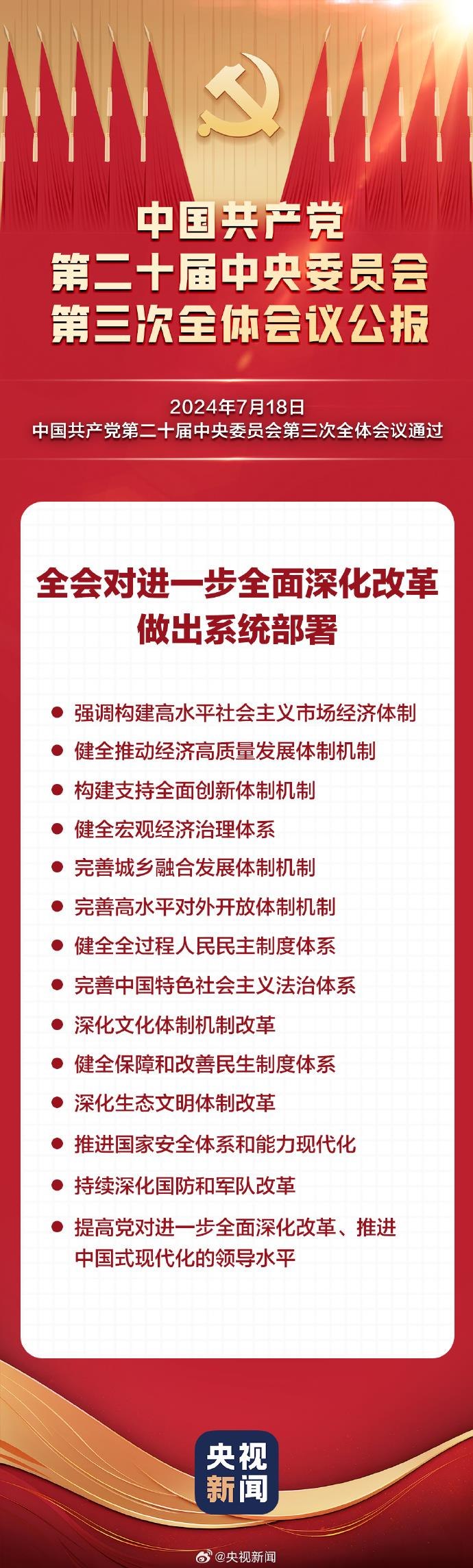 中國共產(chǎn)黨第二十屆中央委員會第三次全體會議于2024年7月15日至18日在北京舉行,全會對進一步全面深化改革做出系統(tǒng)部署,強調(diào)構(gòu)建高水平社會主義市場經(jīng)濟體制,健全推動經(jīng)濟高質(zhì)量發(fā)展體制機制,構(gòu)建支持全面創(chuàng)新體制機制,健全宏觀經(jīng)濟治理體系,完善城鄉(xiāng)融合發(fā)展體制機制,完善高水平對外開放體制機制,健全全過程人民民主制度體系,完善中國特色社會主義法治體系,深化文化體制機制改革,健全保障和改善民生制度體系,深化生態(tài)文明體制改革,推進國家安全體系和能力現(xiàn)代化,持續(xù)深化國防和軍隊改革,提高黨對進一步全面深化改革、推進中國式現(xiàn)代化的領(lǐng)導(dǎo)水平。
