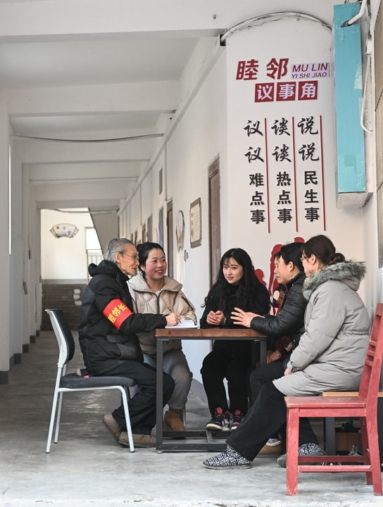 2024年1月25日,在江蘇省句容市崇明街道建新社區(qū),“睦鄰長”、社區(qū)干部、網(wǎng)格員與居民代表一起議事。新華社記者 季春鵬 攝