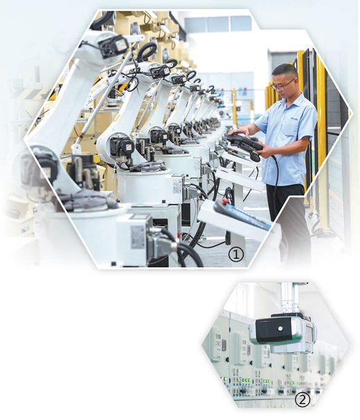 圖①:四川華鎣華鎣山經(jīng)開區(qū),企業(yè)員工在智能車間調(diào)試新安裝的機(jī)器人。邱海鷹攝(人民視覺) 圖②:寧夏銀川金鳳區(qū),智慧配電站房?jī)?nèi)軌道式巡檢機(jī)器人正在開展自主巡檢。袁宏彥攝(人民視覺)
