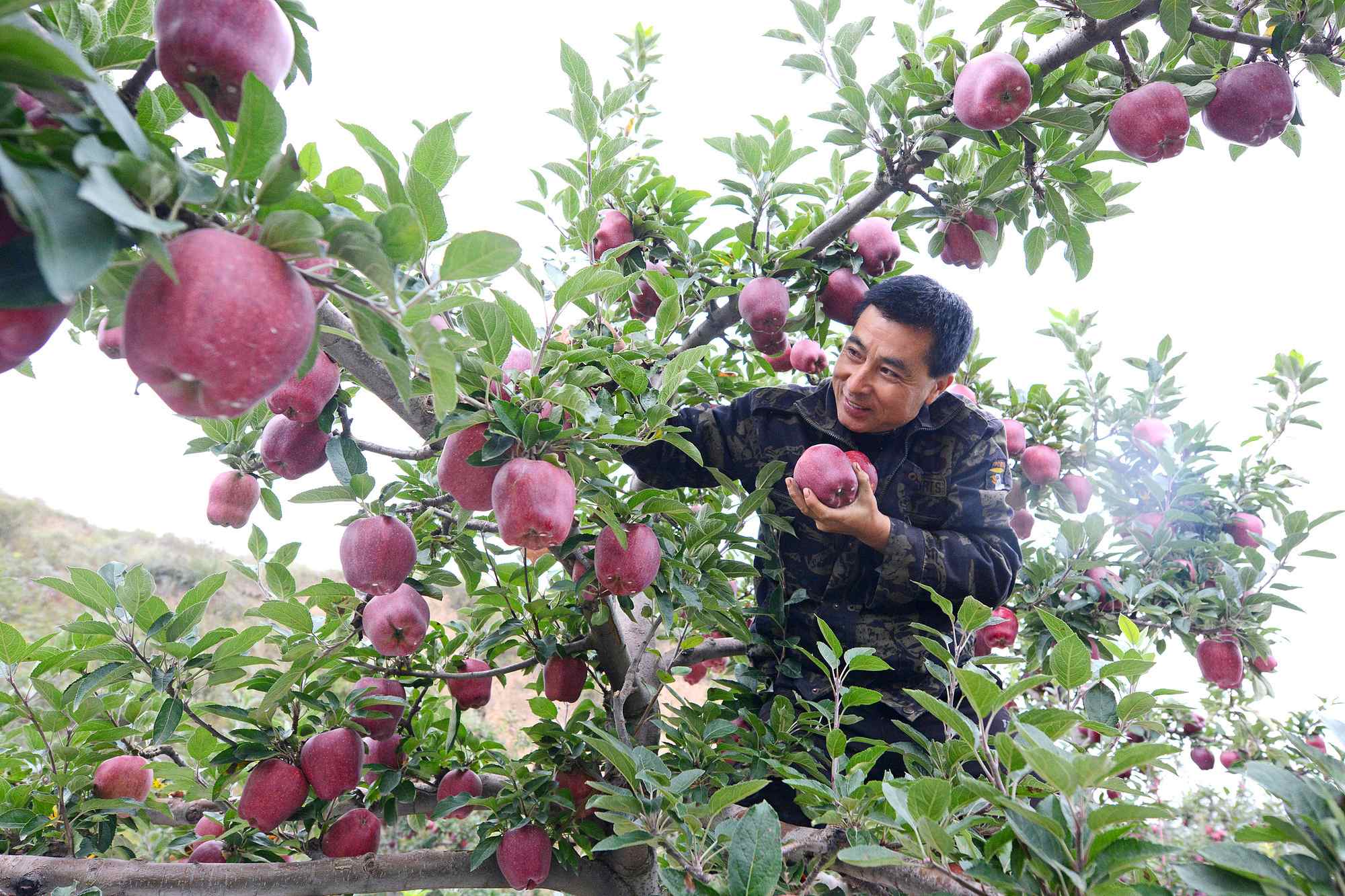 (果農(nóng)在采摘花牛蘋(píng)果)