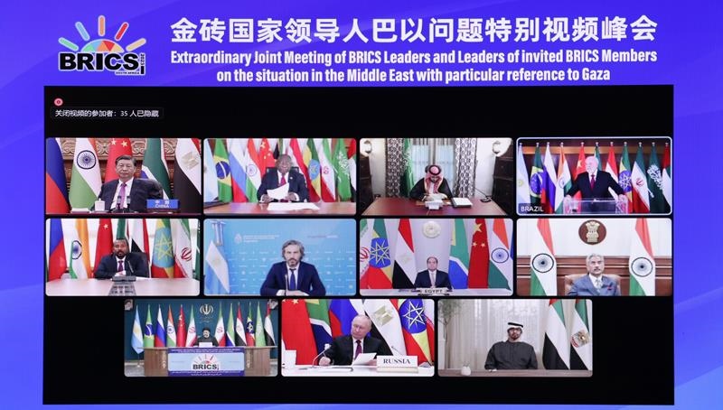 去年11月,金磚國家領(lǐng)導(dǎo)人巴以問題特別視頻峰會召開,與會領(lǐng)導(dǎo)人就應(yīng)對巴以新一輪沖突造成的挑戰(zhàn)并持續(xù)推動巴以問題公正持久解決展開交流,協(xié)調(diào)立場,發(fā)出呼吁,達成共識,并采取積極行動,發(fā)出清晰的正義之聲、和平之聲。
