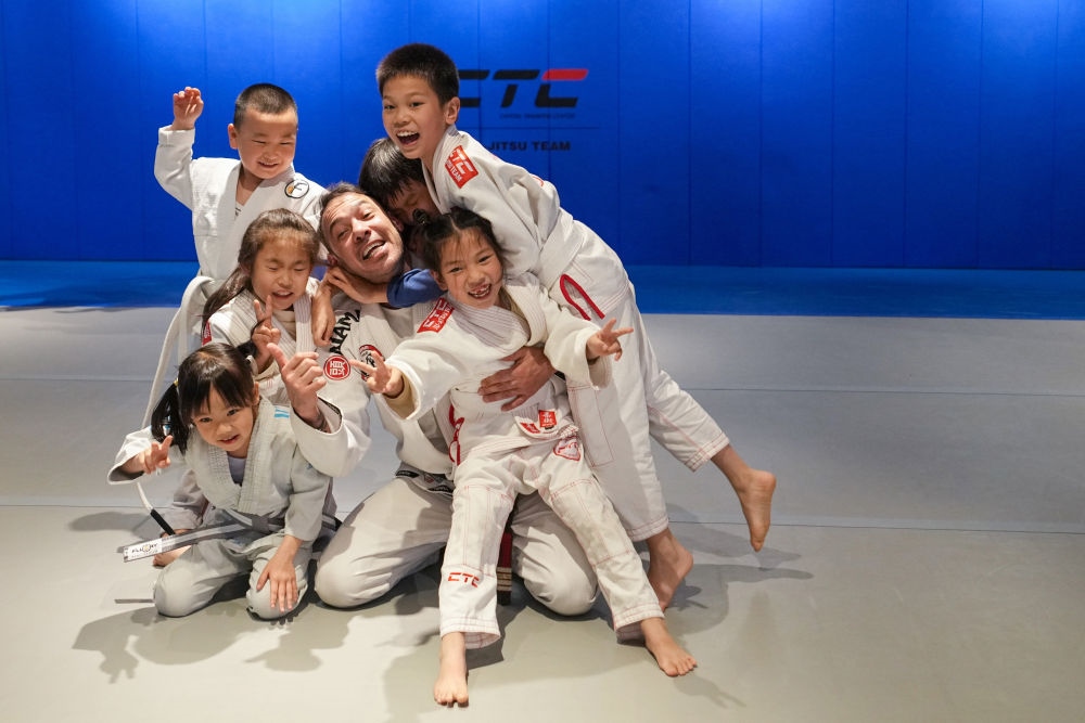 2023年4月7日,在北京一家格斗館內(nèi),巴西柔術(shù)教練席爾瓦(中)在一堂柔術(shù)課結(jié)束后與學生們合影留念。為了更好地了解中國和傳統(tǒng)武術(shù),席爾瓦于2016年來到北京,在一家格斗館擔任巴西柔術(shù)教練。