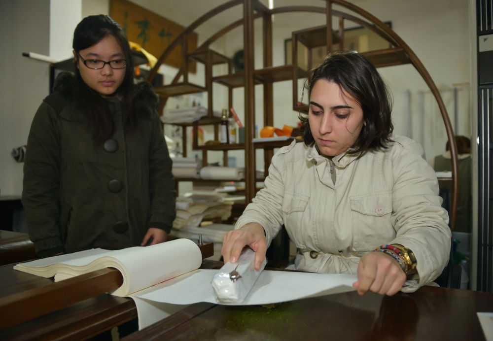 2012年12月20日,巴西留學生瑪麗安娜(右)在杭州一家藝術(shù)館體驗傳統(tǒng)木版水印技藝。