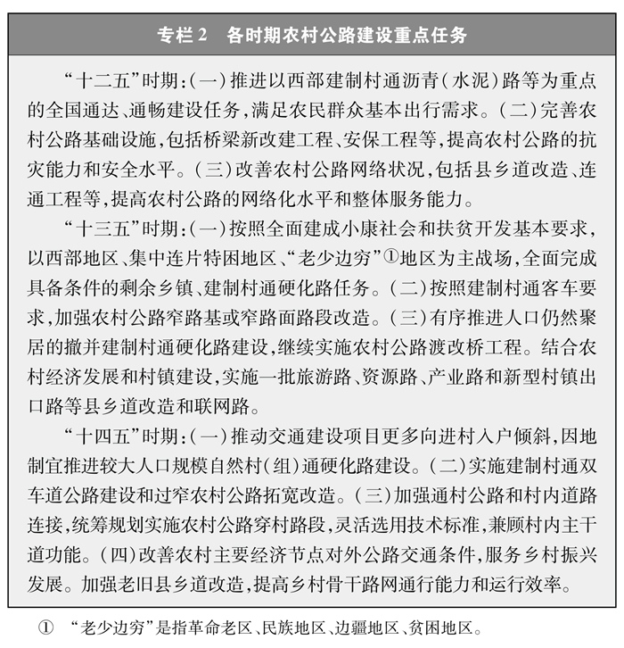 有序推進(jìn)農(nóng)村公路建設(shè)。在中長(zhǎng)期規(guī)劃指引下,制定了公路五年發(fā)展規(guī)劃等階段性規(guī)劃。合理確定不同時(shí)期的農(nóng)村公路發(fā)展目標(biāo)和重點(diǎn)任務(wù)(專(zhuān)欄2),有序?qū)嵤巴ㄟ_(dá)通暢工程”、提檔升級(jí)工程、安全能力提升工程、聯(lián)網(wǎng)路建設(shè)工程等。因地制宜、分區(qū)分類(lèi)施策,統(tǒng)籌推進(jìn)農(nóng)村公路建設(shè),一步一步推進(jìn)、積小勝為大勝,逐步提升農(nóng)村公路服務(wù)能力和水平。