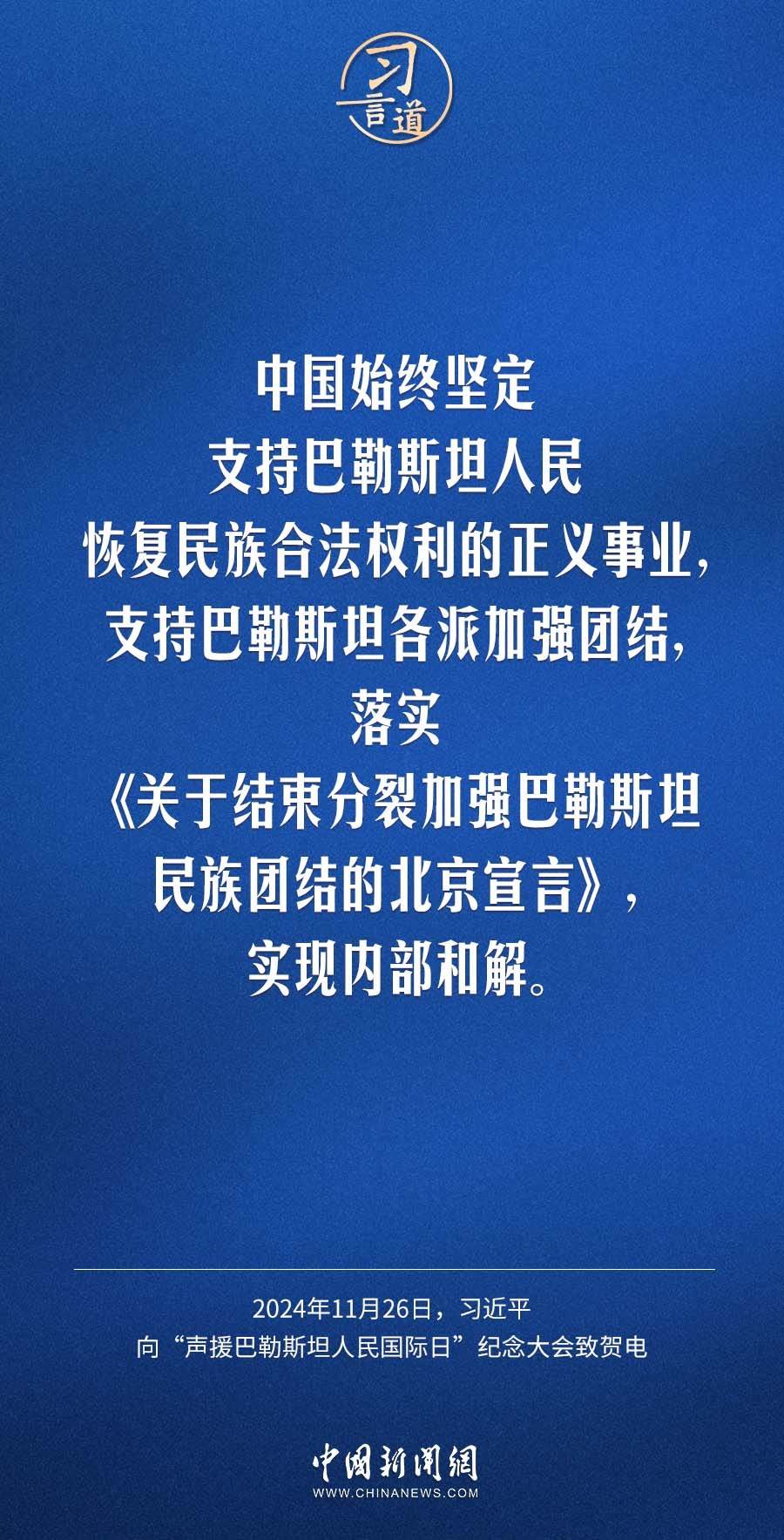 11月26日,聯(lián)合國(guó)舉行“聲援巴勒斯坦人民國(guó)際日”紀(jì)念大會(huì),國(guó)家主席習(xí)近平向大會(huì)致賀電。習(xí)近平指出——