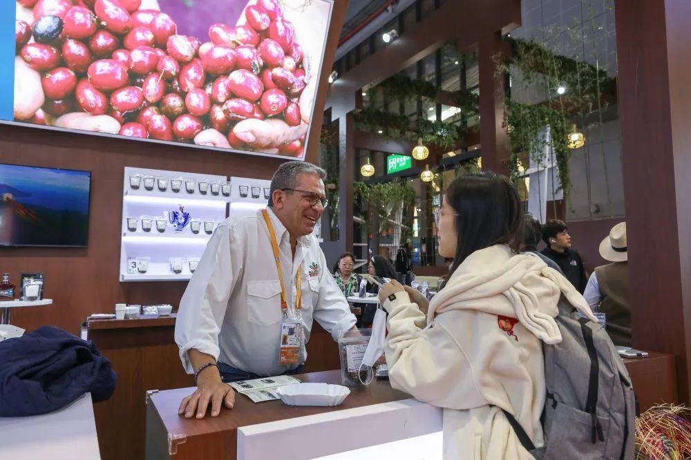 △2024年11月5日,第七屆進(jìn)博會(huì)國(guó)家展尼加拉瓜館的工作人員向觀眾介紹商品。