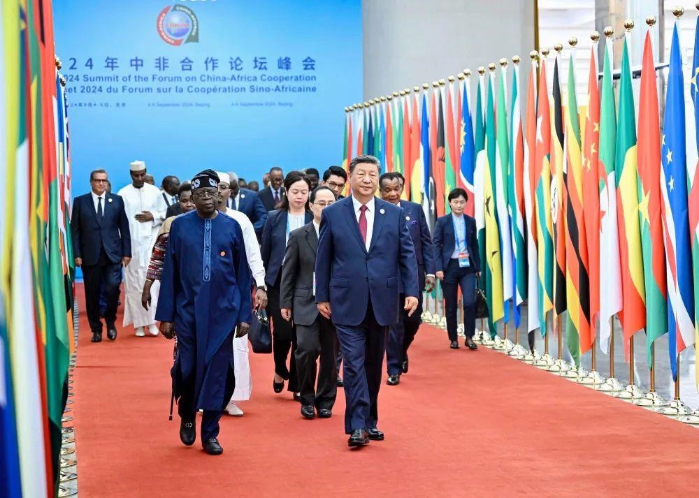 △2024年9月5日,中非合作論壇北京峰會(huì)開幕式,習(xí)近平主席同外方領(lǐng)導(dǎo)人共同步入會(huì)場(chǎng)。