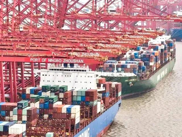 △遠(yuǎn)洋貨輪在浙江寧波舟山港梅山港區(qū)裝卸貨物。