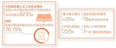 據(jù)全國(guó)人大常委會(huì)代表工委負(fù)責(zé)人介紹,十四屆全國(guó)人大二次會(huì)議期間,全國(guó)人大代表依法履職盡責(zé),對(duì)各方面工作提出建議、批評(píng)和意見9235件,交由213家承辦單位研究辦理,其中,重點(diǎn)督辦建議共20項(xiàng)。