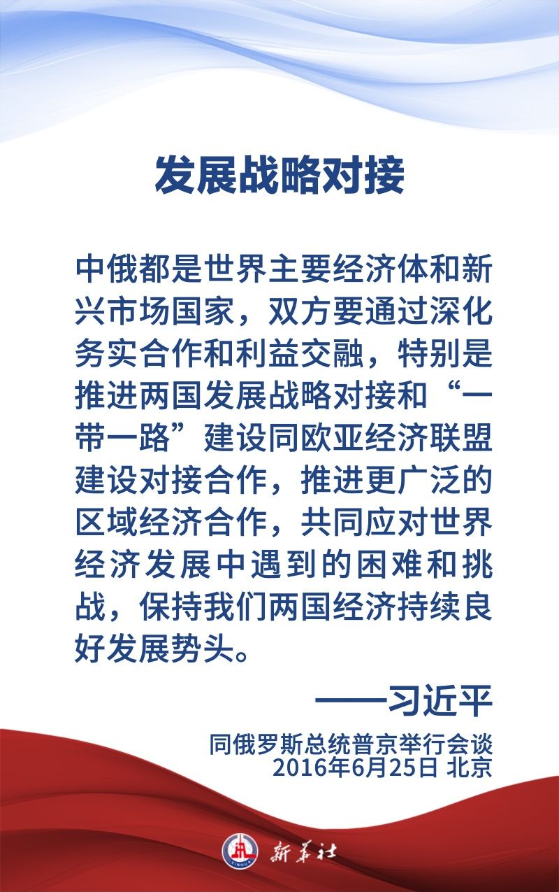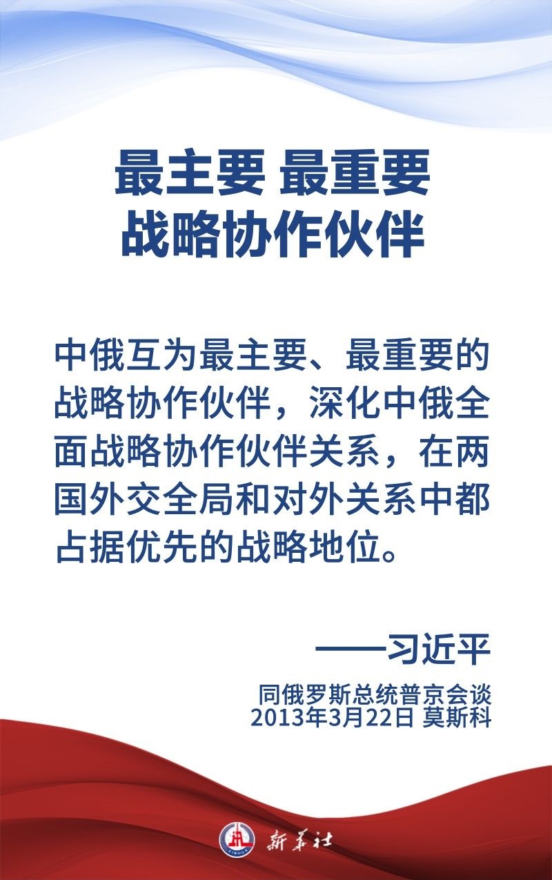 中俄關(guān)系歷經(jīng)風(fēng)雨,歷久彌堅,樹立了大國、鄰國永久睦鄰友好、全面戰(zhàn)略協(xié)作、互利合作共贏的典范。習(xí)近平主席和普京總統(tǒng)保持密切交往,為新時代中俄關(guān)系作出頂層設(shè)計,提供戰(zhàn)略引領(lǐng)。在國事訪問等重要場合,習(xí)近平主席這樣論述中俄關(guān)系——