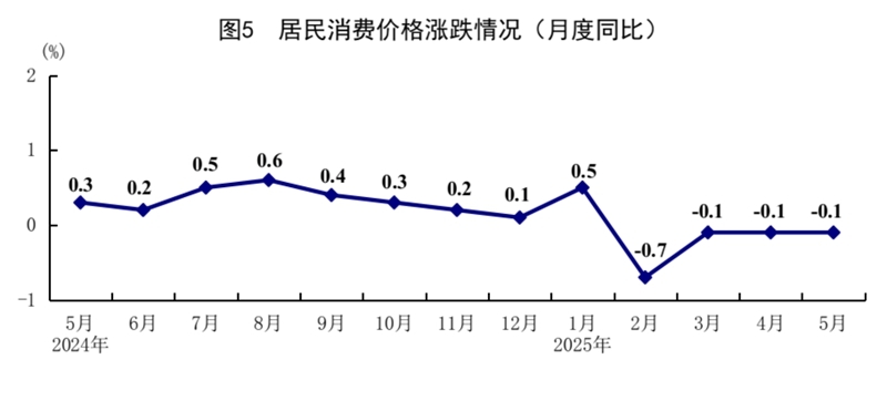 5月份,全國(guó)居民消費(fèi)價(jià)格(CPI)同比下降0.1%,環(huán)比下降0.2%。分類別看,食品煙酒價(jià)格同比上漲0.1%,衣著價(jià)格上漲1.5%,居住價(jià)格上漲0.1%,生活用品及服務(wù)價(jià)格上漲0.1%,交通通信價(jià)格下降4.3%,教育文化娛樂(lè)價(jià)格上漲0.9%,醫(yī)療保健價(jià)格上漲0.3%,其他用品及服務(wù)價(jià)格上漲7.3%。在食品煙酒價(jià)格中,鮮菜價(jià)格下降8.3%,糧食價(jià)格下降1.4%,豬肉價(jià)格上漲3.1%,鮮果價(jià)格上漲5.5%??鄢称泛湍茉磧r(jià)格后的核心CPI同比上漲0.6%,漲幅比上月擴(kuò)大0.1個(gè)百分點(diǎn)。1—5月份,全國(guó)居民消費(fèi)價(jià)格同比下降0.1%。