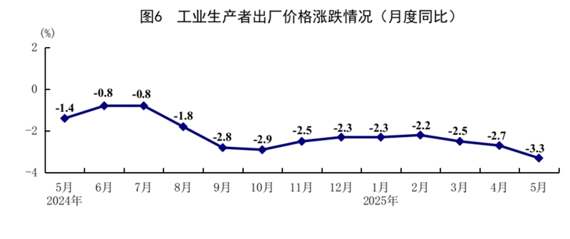 5月份,全國(guó)工業(yè)生產(chǎn)者出廠價(jià)格同比下降3.3%,環(huán)比下降0.4%;全國(guó)工業(yè)生產(chǎn)者購(gòu)進(jìn)價(jià)格同比下降3.6%,環(huán)比下降0.6%。1—5月份,全國(guó)工業(yè)生產(chǎn)者出廠價(jià)格和購(gòu)進(jìn)價(jià)格均比上年同期下降2.6%。