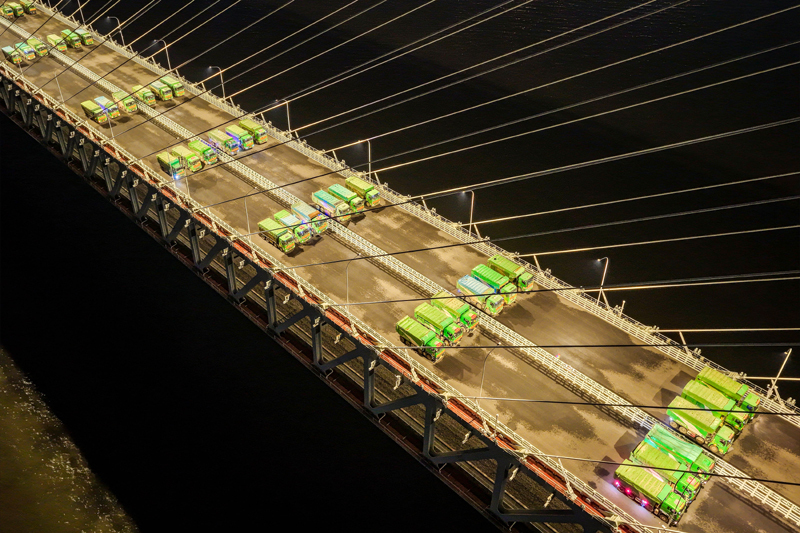 6月20日晚,常泰長江大橋主航道橋進行4400噸荷載試驗,110輛重型卡車駛上主航道橋面,啟動靜態(tài)荷載試驗。自6月16日起,常泰長江大橋開啟為期一周的荷載試驗,對大橋承載力和安全性進行全面評估。