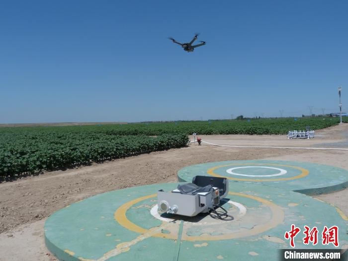 6月28日,新疆石河子市一片棉田中,遙感監(jiān)測作物長勢的無人機巡檢返回?!≮w婧姝 攝