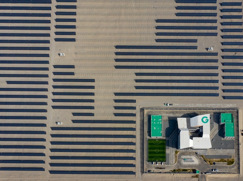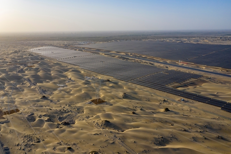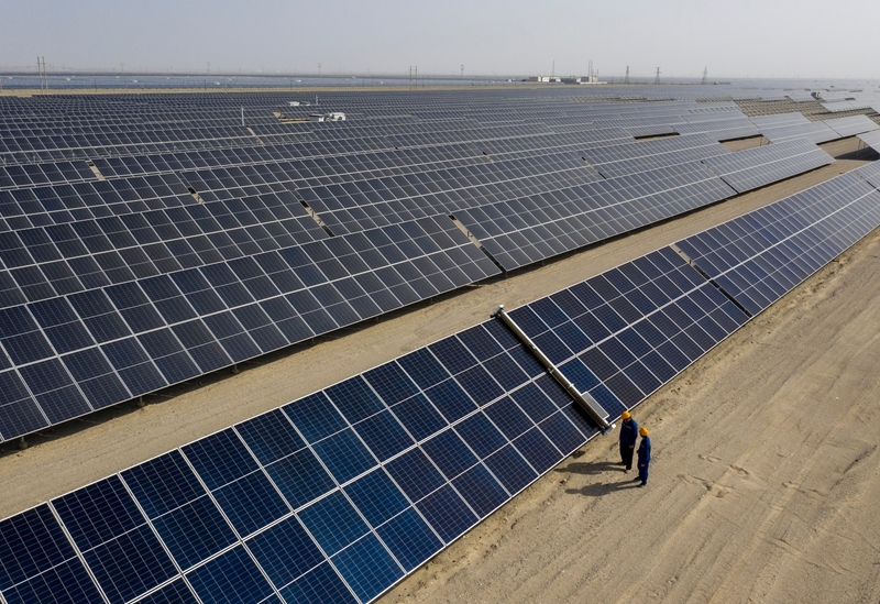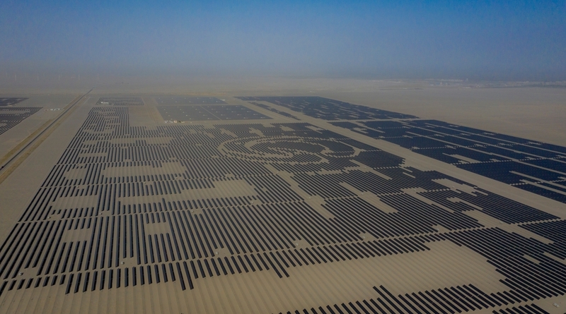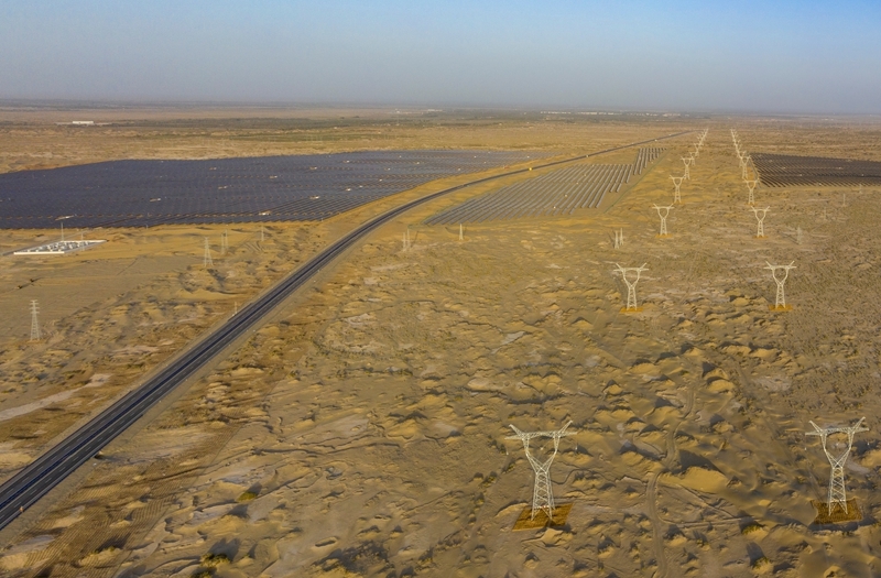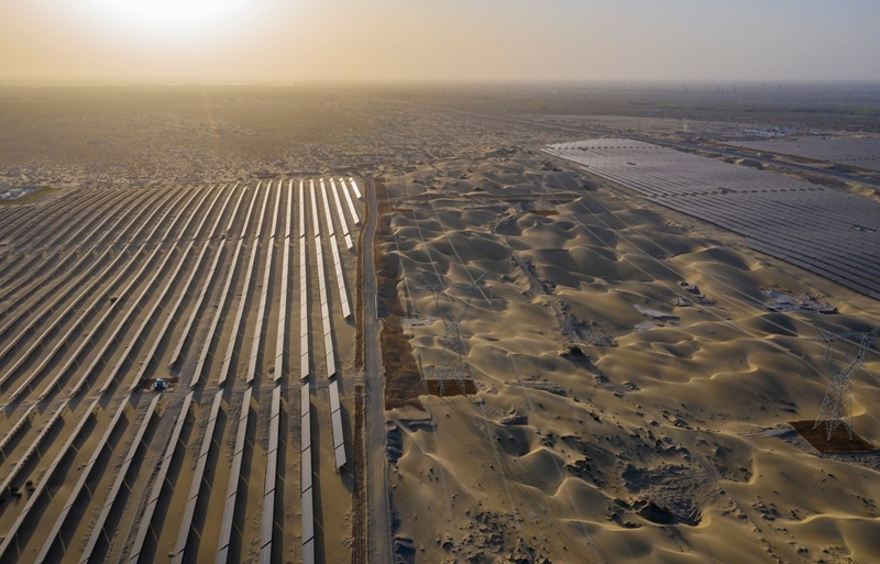 昔日的戈壁荒漠,如今由太陽(yáng)能光伏板匯聚成“藍(lán)色海洋”,由風(fēng)力發(fā)電機(jī)組成“白色森林”,正孕育著無(wú)限“風(fēng)光”。