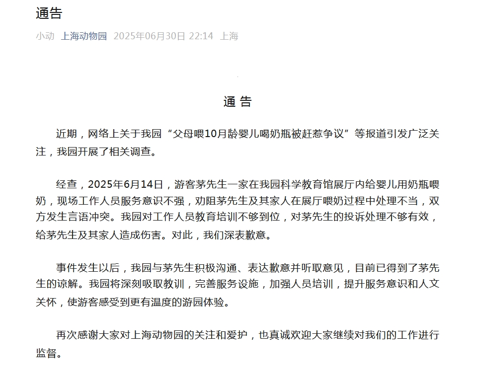 《通告》中稱,經(jīng)查,2025年6月14日,游客茅先生一家在該動(dòng)物園科學(xué)教育館展廳內(nèi)給嬰兒用奶瓶喂奶,現(xiàn)場(chǎng)工作人員服務(wù)意識(shí)不強(qiáng),勸阻茅先生及其家人在展廳喂奶過(guò)程中處理不當(dāng),雙方發(fā)生言語(yǔ)沖突。對(duì)工作人員教育培訓(xùn)不夠到位,對(duì)茅先生的投訴處理不夠有效,給茅先生及其家人造成傷害。對(duì)此,上海動(dòng)物園深表歉意。