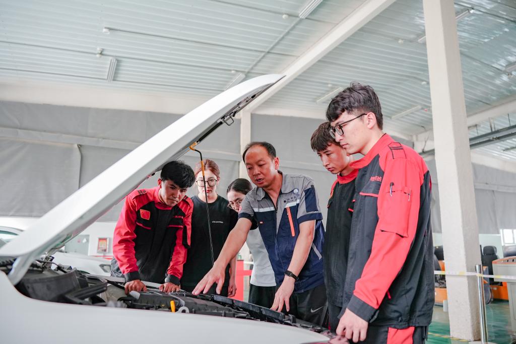 2025年6月27日,在新疆和田技師學院,北京援疆教師李寶(右三)和當?shù)亟處熞煌笇W生維修汽車。新華社記者 徐宏巖 攝