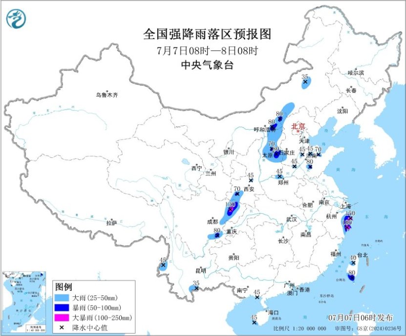 預(yù)計(jì),7月7日08時(shí)至8日08時(shí),浙江東部、內(nèi)蒙古中部、山西中北部、河北西北部和西南部、山東北部、河南西北部、陜西西南部、四川東部、云南西南部、臺(tái)灣島等地部分地區(qū)有大到暴雨,其中,浙江東部、四川東部等地部分地區(qū)有大暴雨(100~180毫米)。上述部分地區(qū)伴有短時(shí)強(qiáng)降水(最大小時(shí)降雨量20~50毫米,局地可超過(guò)70毫米),局地有雷暴大風(fēng)等強(qiáng)對(duì)流天氣。中央氣象臺(tái)7月7日06時(shí)繼續(xù)發(fā)布暴雨藍(lán)色預(yù)警。